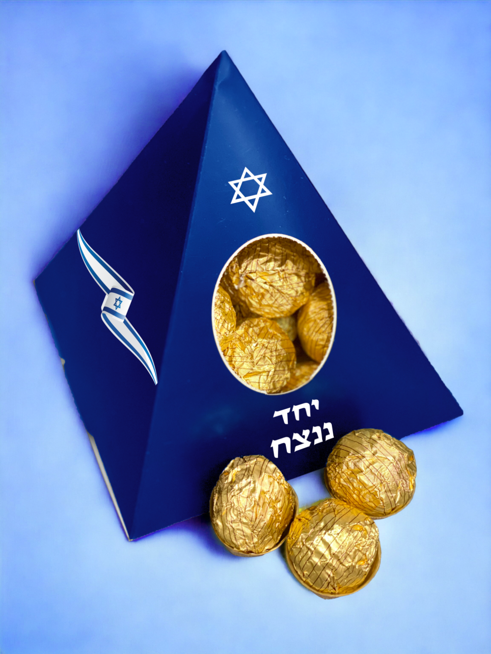 מארז מתנה ייחודי בצורת פירמידה, בעיצוב כחול מרשים עם מיתוג חברתכם וכיתוב "יחד ננצח".
